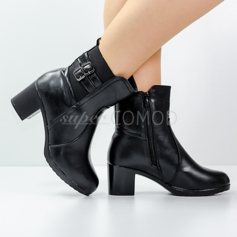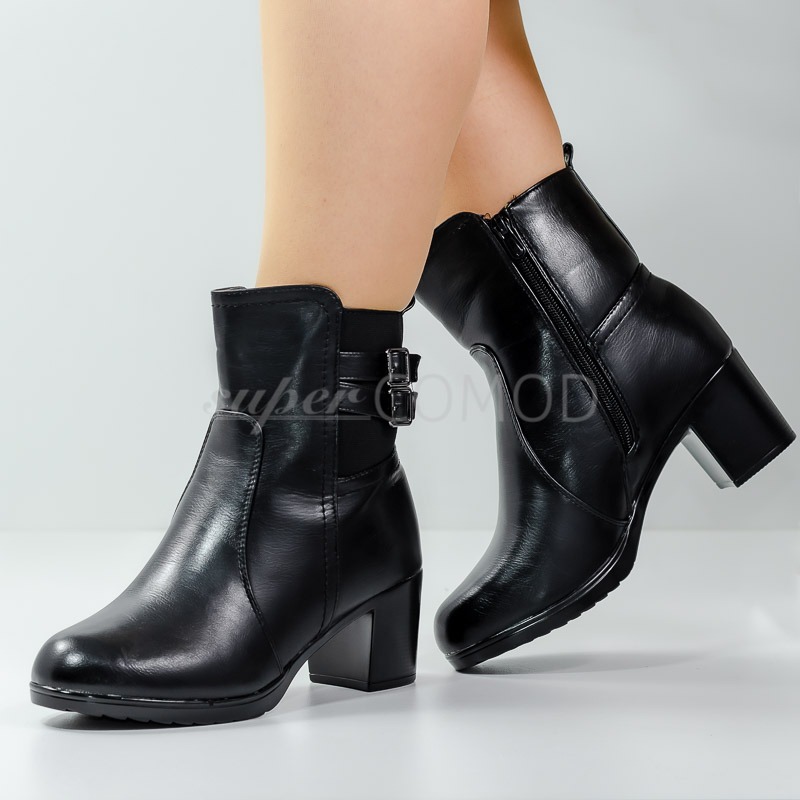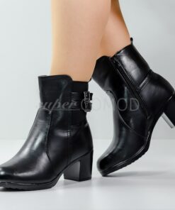 Botine cu toc pătrat de 5 cm,model căptușit,prevăzute cu fermoar lateral,accesorizate cu cataramă și inserție elastică pentru a se mula și pe o gambă mai groasă,foarte comode,ideale de zi cu zi!